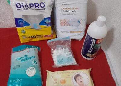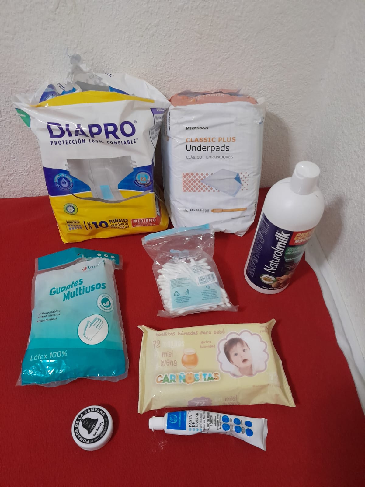 Los pañales que usamos son Prevail y Diapro. Que son baratas y de buena calidad, es importante que sean de cinta y no de pull ups. Ocupamos de todas las tallas. Los tapetitos son unitalla. La crema, no importa la marca, es solo para mejorar la limpieza. Igual las toallitas húmedas; En promedio, cada niño utiliza 3 paquetes por semana de pampers. 2 de guantes ( usando 1 por vez nadamás, para que «rindan»). Toallitas de 3 a 4 paquetes. Crema, 1 bote cada 2 semanas. Pasta lassar 1 por semana.